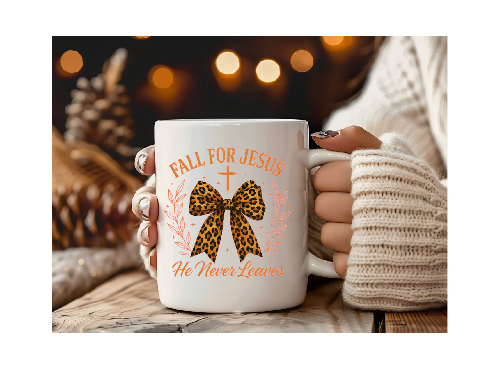This 11 oz coffee mug features a charming "Fall for Jesus" print, perfect for enjoying your favorite hot beverages with a meaningful message. Crafted for everyday use, it combines durability with a heartfelt design, making it an ideal gift or personal keepsake to inspire faith throughout the day. Its standard size fits comfortably in hand and most coffee makers, balancing practicality with spiritual encouragement.