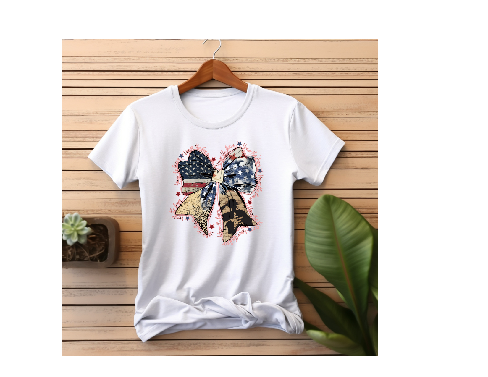 Celebrate patriotism with this Support Our Troops 4th of July T-shirt, crafted from a comfortable poly-cotton blend for durability and softness. Featuring a charming bow design, it combines festive style with a meaningful message, making it perfect for showing your support during Independence Day events. Its breathable fabric ensures all-day comfort, whether at a parade or a family gathering.